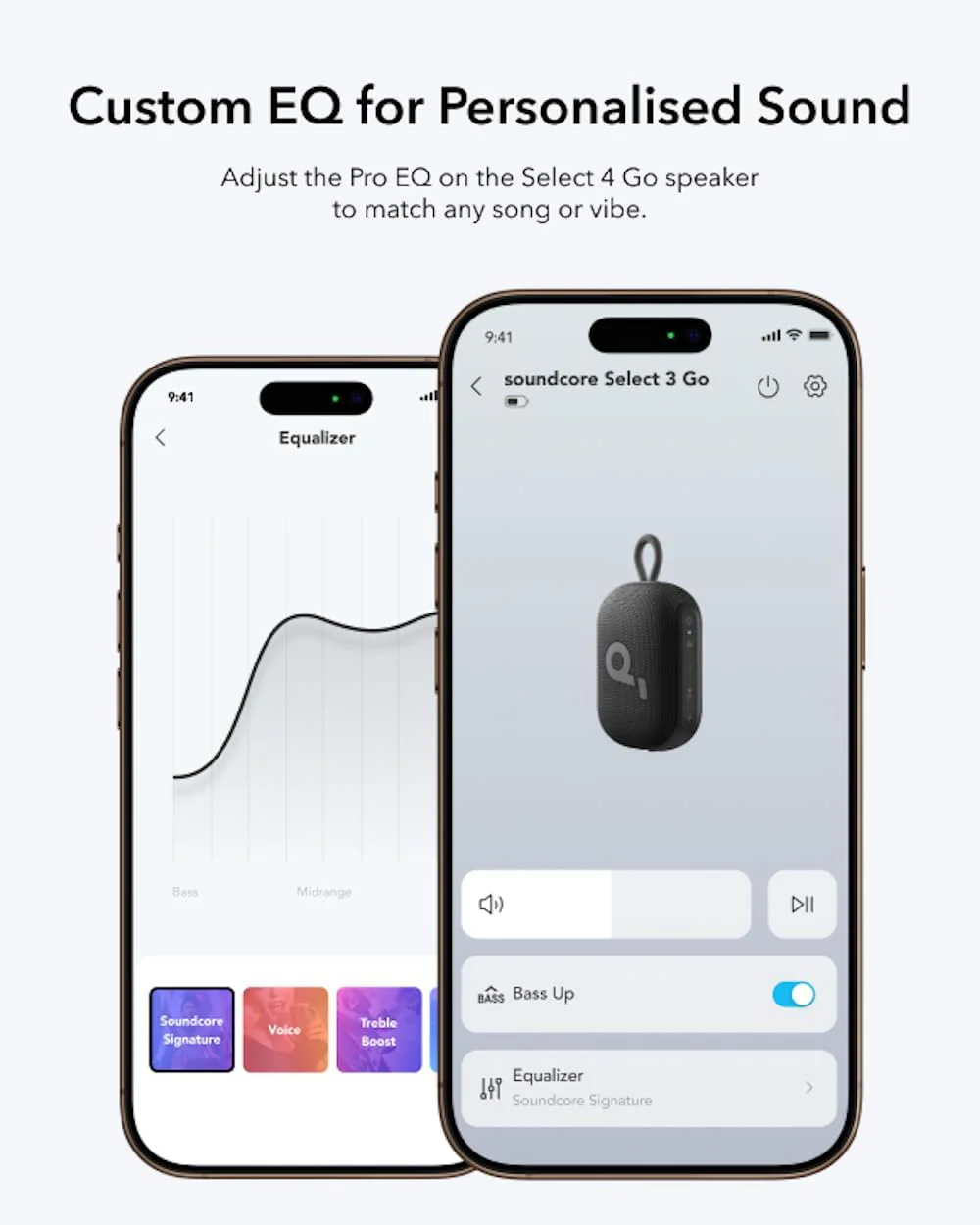 - Customisable EQ for Personalised Sound: Select 4 Go portable speaker uses a customisable Pro EQ to find the perfect sound for any song or vibe.
